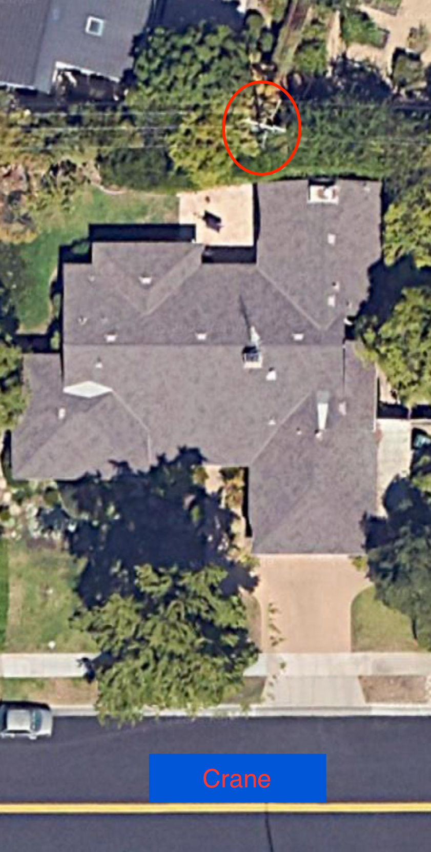 To the right is a capture from a Google Map. The power pole is at the center of the red oval. The crane is about where the blue rectangle is near the bottom. Using the scale bar on the map, the distance from the crane to the pole is about 130 ft. And it's on the far side of the house.